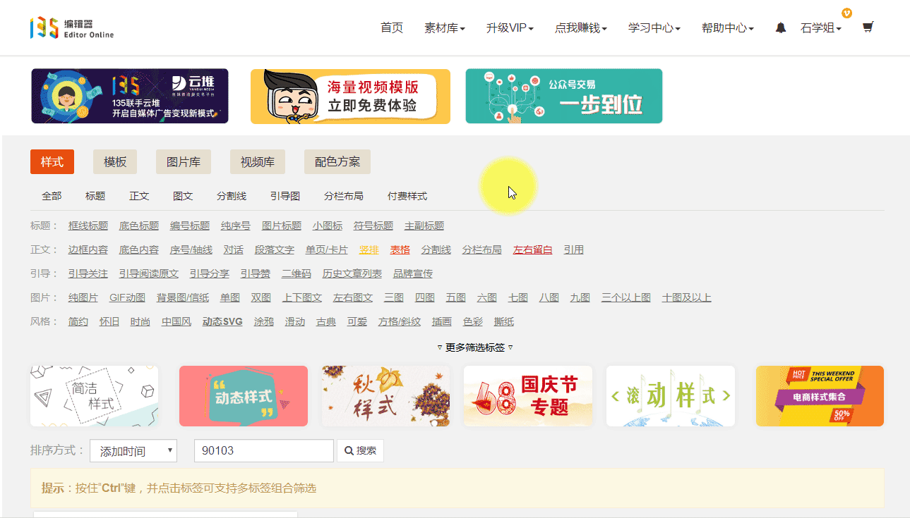 1進(jìn)135編輯器首頁,點(diǎn)擊:素材庫-樣式中心,搜索收藏。