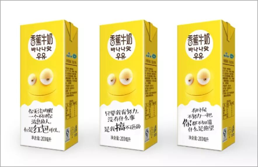 比如下面舉的香蕉牛奶這個包裝,三個盒子上的文案都透著“喪”文化氣息,其實非常符合當代年輕人自嘲的口味。