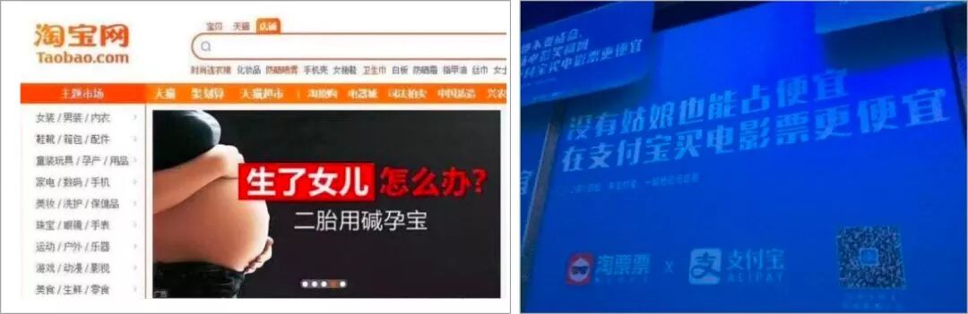 再來看看阿里巴巴,今年 4 月,淘寶網(wǎng)首頁 Banner 公然放出了配字“生了女兒怎么辦?二胎用堿孕寶”的廣告,這其中是妥妥違法的性別歧視。