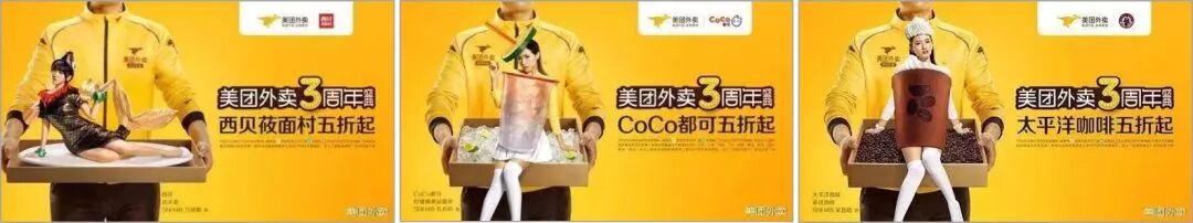 2016 年,美團外賣 3 周年時,直接把女性物化成食物:一個男性外賣配送員端著盤子,盤中是一個個代表著奶茶、披薩、咖啡、漢堡等食物的妹紙。秀色可餐不是這樣用的好嗎?