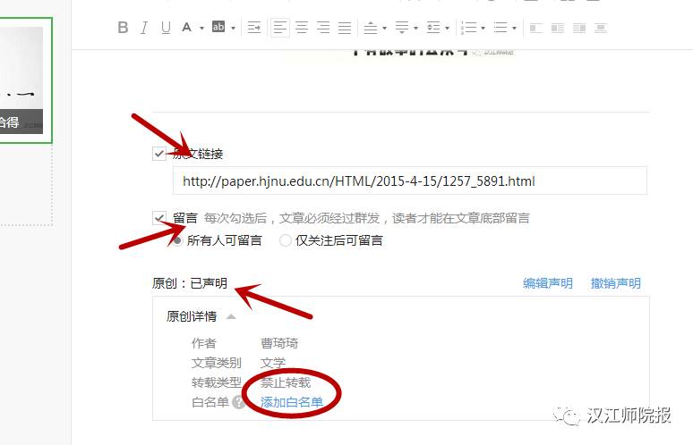 注意:設(shè)置原創(chuàng)時選擇禁止轉(zhuǎn)載,當(dāng)別人需要轉(zhuǎn)載時把他微信號添加到白名單授權(quán),這樣別人可以根據(jù)自己的需要進(jìn)行內(nèi)容修改