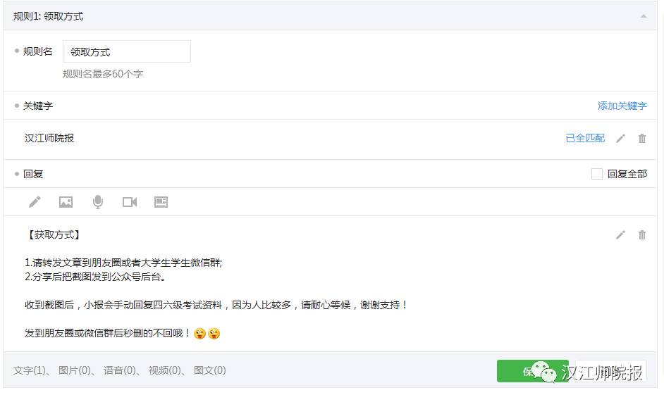 別人在后臺留言時,可以添加一些回復(fù),系統(tǒng)根據(jù)內(nèi)容自動回復(fù)(這個功能就自己摸索啦