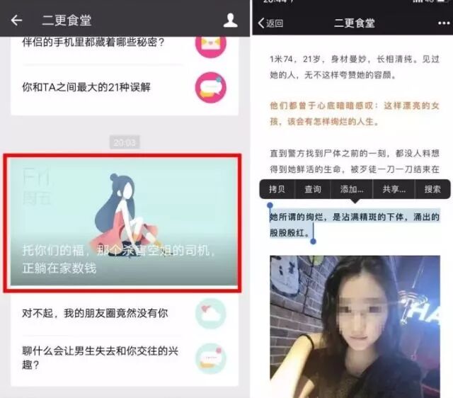 2018年5月的二更食堂被封號事件,是追熱點(diǎn)作死典型案例。事件源于5月11日,二更食堂公眾號發(fā)布的一篇名為《托你們的福,那個殺害空姐的司機(jī),正躺在家數(shù)錢》的文章,該文章對最近備受關(guān)注的“滴滴司機(jī)殺害空姐”一案進(jìn)行了不當(dāng)描述,引起了大量用戶的強(qiáng)烈反感。