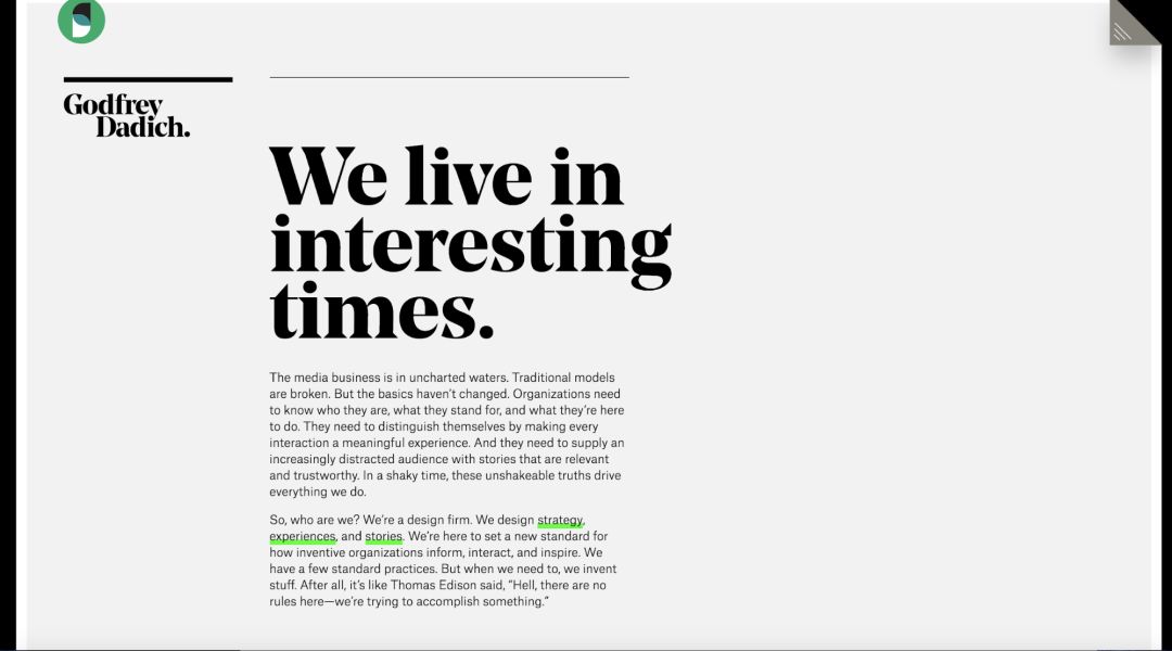 Godfrey Dadich 是一個來自舊金山的設計機構,由于首頁上長篇大論的內容,為了讓用戶抓住重點,使用了熒光綠的高亮標識。