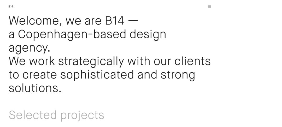 總部設在哥本哈根的設計機構 B14 就使用了簡單直白的文本內容填滿了主頁,用來呈現他們的工作內容: