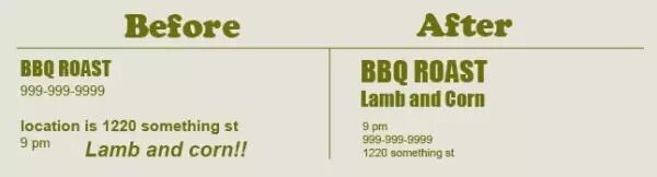 信息的歸類意味著將相似的內(nèi)容排列在一起,這樣能使信息表達(dá)更加明確。下面是兩種排版,把關(guān)鍵詞整合到一起更能抓住人的眼球,雜亂的歸類和排版則讓觀眾難以讀懂。