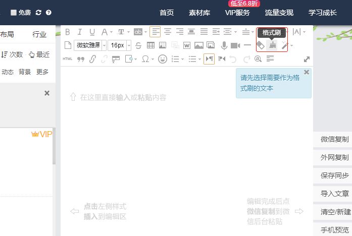 打開135編輯器,在菜單欄中找到【格式刷】,點擊格式刷就可以使用啦!