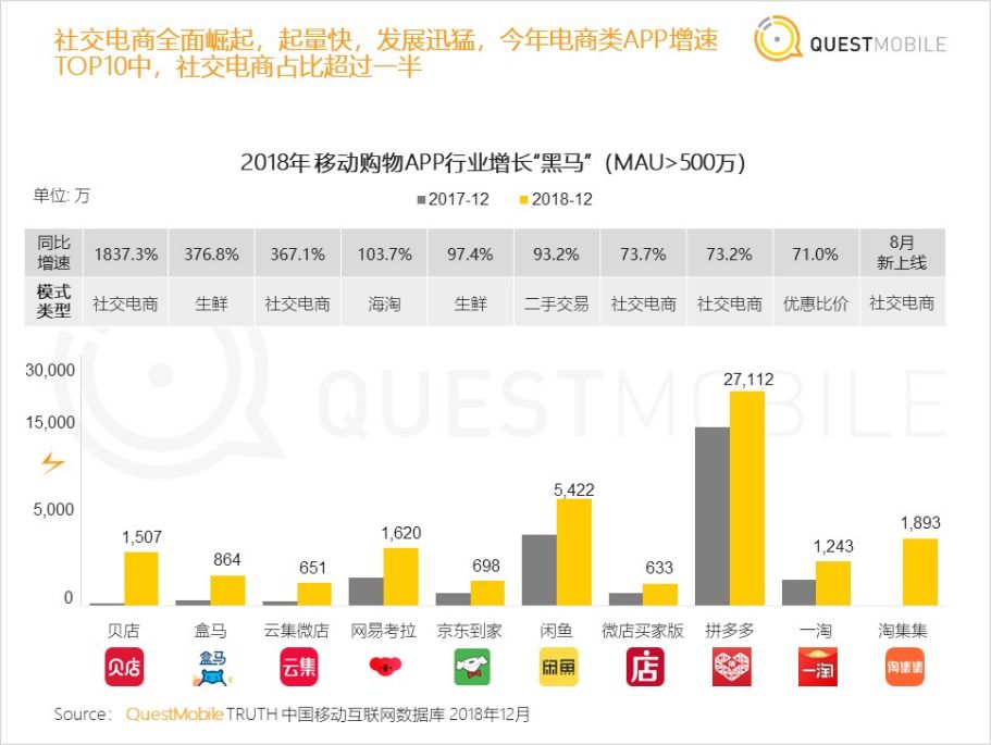而在電商領(lǐng)域,也有不少 App 利用“社交”打出了自己的天地。由互聯(lián)網(wǎng)專業(yè)數(shù)據(jù)機(jī)構(gòu) QUEST MOBILE 出品的《中國移動(dòng)互聯(lián)網(wǎng)2018年度大報(bào)告》顯示,2018 年電商類 App 增速TOP 10 中,就有 5 家社交電商。