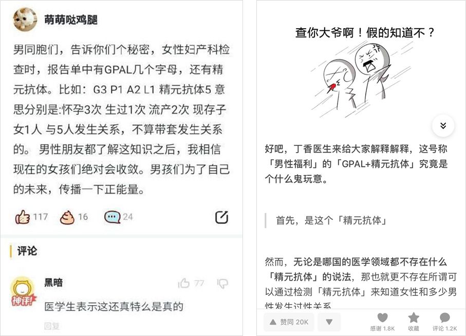 這個(gè)謠言也是利用了大多數(shù)人的知識(shí)盲區(qū)進(jìn)行傳播的。GPAL 是啥?精元抗體是啥?普通網(wǎng)友根本不了解這些專(zhuān)業(yè)術(shù)語(yǔ),而這則謠言的“目標(biāo)用戶(hù)”男性朋友們可能也不了解婦科檢查。
