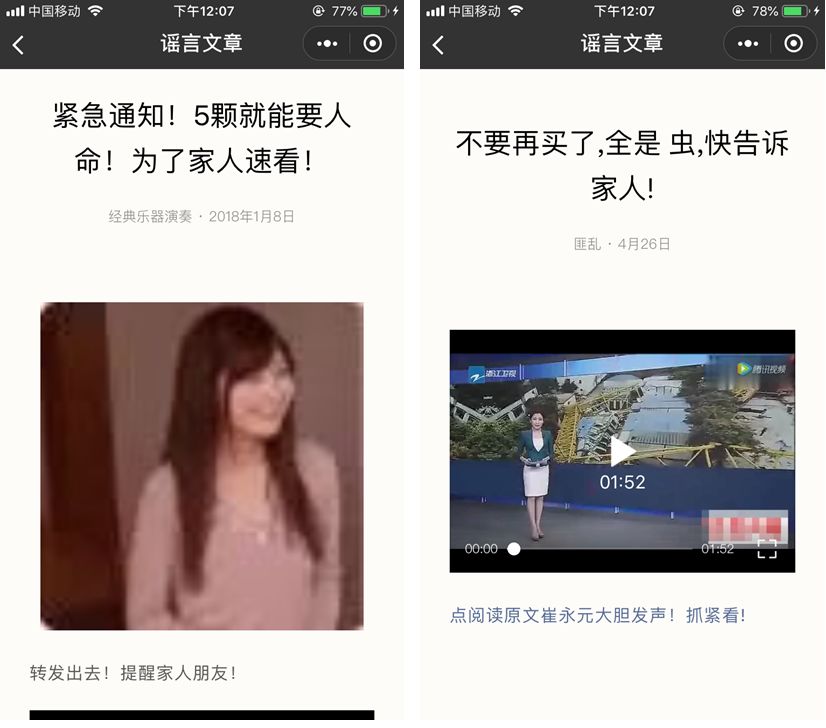 一些謠言的標(biāo)題里就會(huì)帶上“對(duì)你很重要”、“莫害孩子”、“一定要讓長(zhǎng)輩當(dāng)心”等字眼。還有許多謠言往往會(huì)在結(jié)尾進(jìn)行“升華”,類(lèi)似: