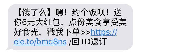 一般情況下,用戶未使用 App 的一段時(shí)間內(nèi),會(huì)收到短信提醒,刺激用戶再次使用。比如餓了么的短信基本以送紅包活動(dòng)為主,在用戶飯點(diǎn)之前或一段時(shí)間沒使用后,會(huì)主動(dòng)推送紅包,激勵(lì)用戶進(jìn)入 App 進(jìn)行消費(fèi)。