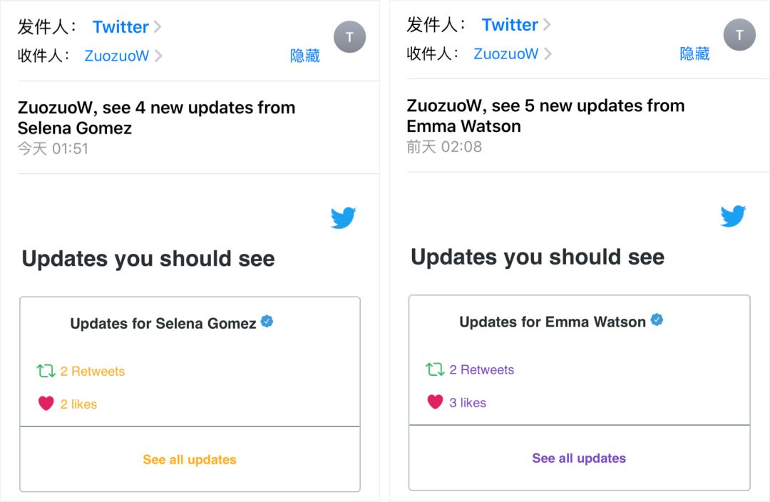 比如,Twitter 總是用“你關(guān)注的 XX 發(fā)布了幾條狀態(tài),你應(yīng)該看看”的郵件來吸引用戶。