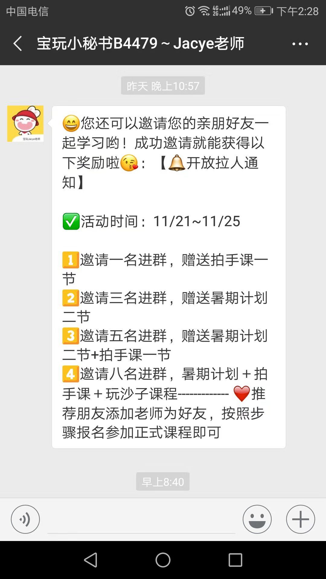 在試聽課的學(xué)習(xí)過程中,老師也會私聊用戶,用階梯激勵的方式,激勵用戶邀請好友報名課程。只要用戶推薦好友報名正式課程,就可以獲得課程獎勵,邀請好友數(shù)越多,獎勵越豐富。