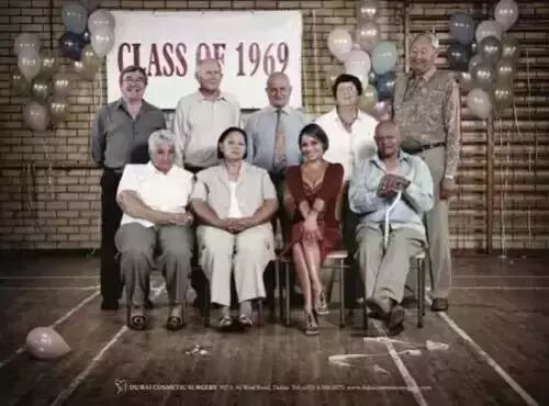 廣告內(nèi)容是1969年畢業(yè)的一群老人多年后的同學(xué)會(huì),基本都是老頭老太,而中間一位面帶自信笑容的紅衣少婦無論面容和身材,都像是他們的孫女輩。很明顯,她也是同學(xué)之一,整個(gè)廣告都凸顯了整容的魅力和成功。