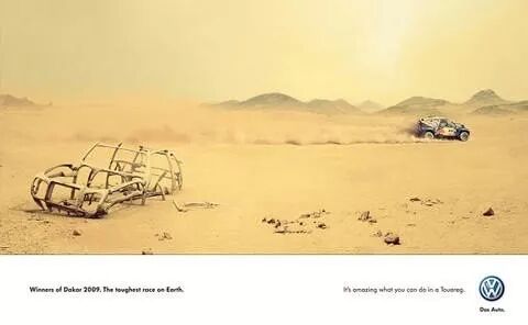 還有大眾汽車一個(gè)以“地球上最艱苦的比賽”為題的廣告,其他品牌的車在環(huán)境惡劣的沙漠中慢慢只剩下殘骸,整個(gè)畫面也是一片蕭條,而大眾汽車依然是在沙漠中飛速奔馳,性能耐力十足。