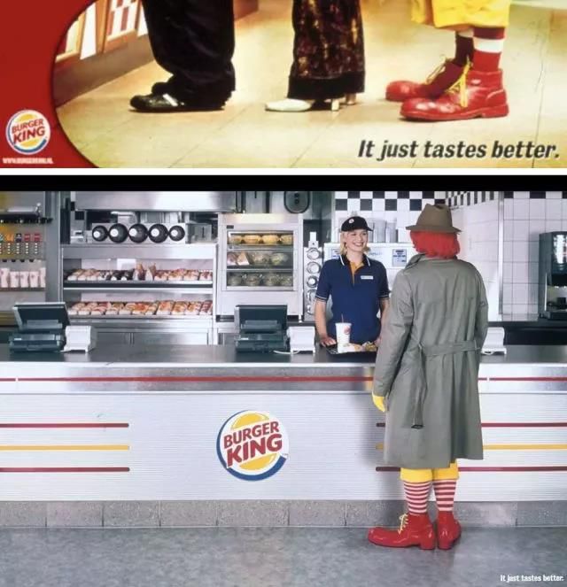最后,怎么將這兩者結(jié)合形成反差呢?麥當(dāng)勞叔叔自己都無法拒絕美味,還喬裝打扮來買漢堡王。這種反差沖突馬上就告訴了你誰更美味。