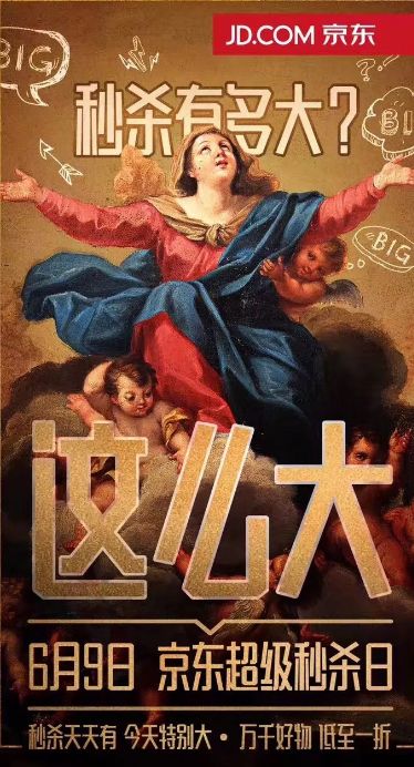 京東在去年618期間推出“京東秒殺日,今天特別大”的海報(bào),也是把大家熟悉的世界名畫給予了全新視覺,反差感立馬就出來了。