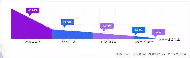 根據(jù)卡思數(shù)據(jù)公布的截至 2018 年 8 月 17 日的數(shù)據(jù),在抖音認(rèn)證的藍(lán) V 中,1 萬(wàn)粉絲以下的企業(yè)號(hào)占據(jù)了 60% 以上。