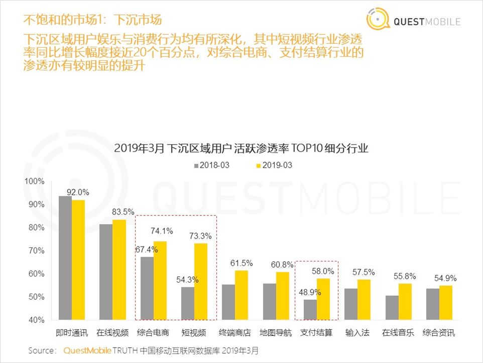 從 QUESTMOBILE 今年第一季度發(fā)布的數(shù)據(jù)報告來看,下沉市場用戶活躍滲透率 Top10 中,短視頻、電商的滲透率位居前列;而短視頻的增幅接近 20 個百分點,排名第一。