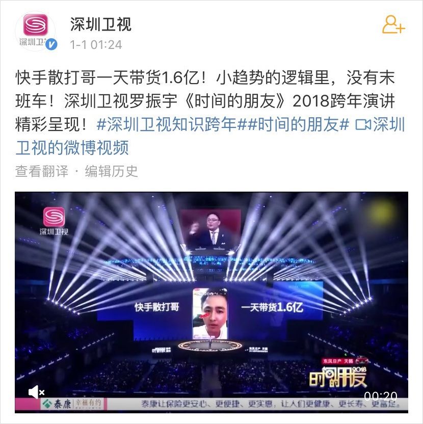 在今年羅振宇的 2018 跨年演講《時間的朋友》中,散打哥還被羅胖“點名”,被當做抓住“直播電商”小趨勢的代表人物。
