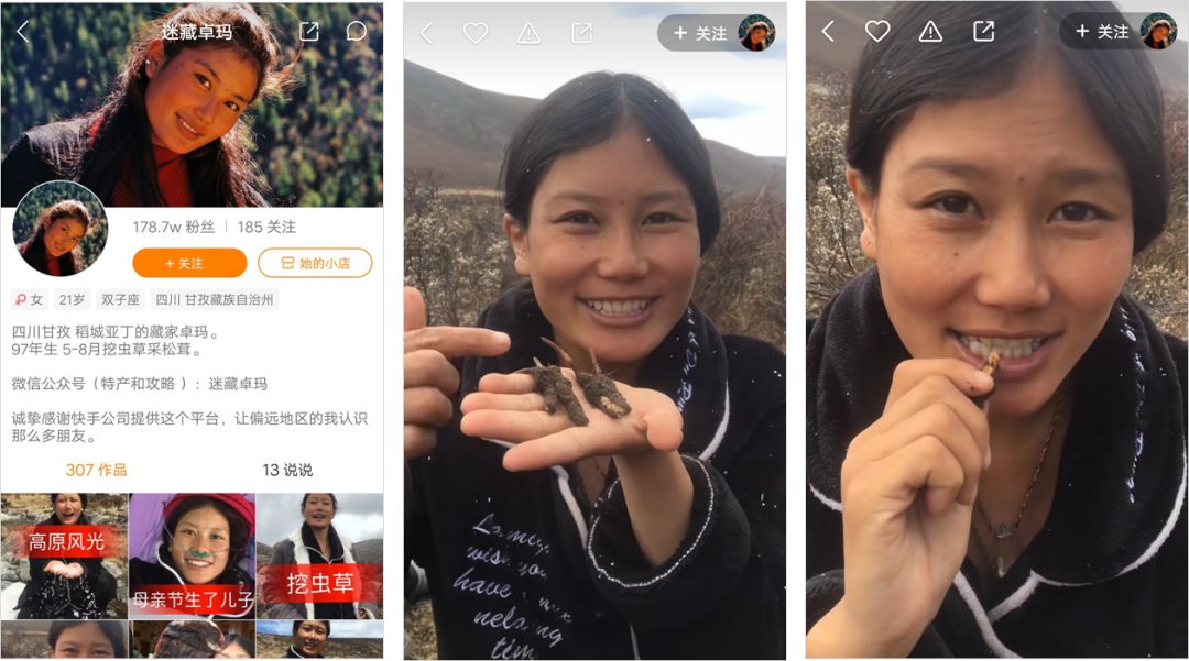 再比如只有小學文憑的藏族姑娘格絨卓姆,在快手上擁有近 180 萬的粉絲,她的動態(tài)大多是挖蟲草的視頻,有時候還會現(xiàn)挖現(xiàn)吃。她曾利用快手一個月幫助整個村賣了 30 多萬元的蟲草,被“老鐵”們親切地稱作“松茸西施”。