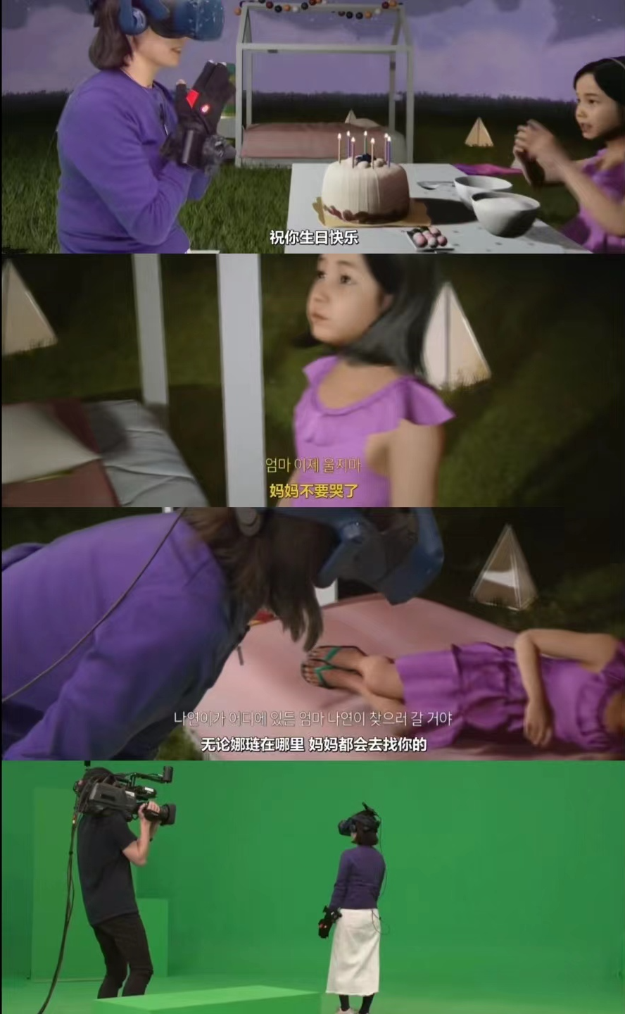 不僅如此,在一部名為《遇見(jiàn)你》的紀(jì)錄片中,一位韓國(guó)媽媽借助VR技術(shù),在虛擬世界,看到了已經(jīng)去世三年的女兒喊著“媽媽”撲向她的懷中,即使最終抱的一場(chǎng)空,女兒化蝶離開(kāi),這卻是這位不幸的母親的最溫暖的慰藉。